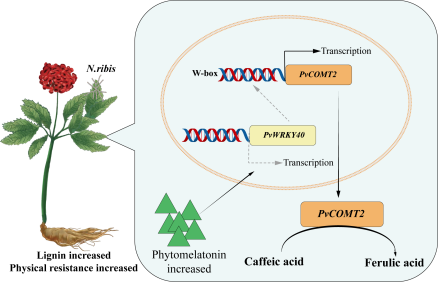 该研究采集了元阳县和金平县多个越南人参种植基地中的叶枯病植株进行了病原菌的分离,经过形态学和分子生物学鉴定其为真菌类新壳梭孢菌属Neofusicoccum ribis,人工接种分离菌株,可以引起越南人参叶片发病,症状与田间一致;利用转录组鉴定到了木质素合成通路和植物激素信号转导通路参与到了越南人参对N.ribis侵染的应答过程中;外源喷施茉莉酸、水杨酸、褪黑素发现褪黑素对木质素的诱导效果最佳,也能显著增加越南人参对N.ribis的抗性;进一步的分析发现,PvWRKY40与PvCOMT2不仅响应N.ribis侵染,还响应褪黑素的诱导。EMSA实验和双LUC实验证明了PvWRKY40与PvCOMT2启动子之间的特异性结合;通过叶盘法成功的在本氏烟草中过表达PvCOMT2,PvCOMT2-OE的烟草拥有更多的木质素含量,更粗壮的植物茎秆,更强的抗病能力。研究发现,越南人参在感知到Neofusicoccum ribis后,会激活体内JA、SA、MT的合成,内源褪黑素含量的上升抑制了PvWRKY40的表达水平,解除了PvWRKY40对PvCOMT2的抑制,最终引起木质素积累水平的提高,增强越南人参对Neofusicoccum ribis的物理抗性。