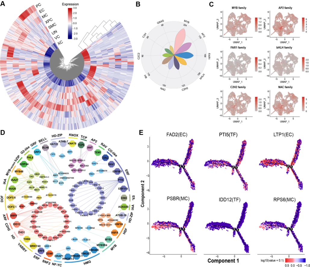 该研究将茎尖细胞划分为7大主要类型,共14个亚群,解析了各细胞簇在发育过程中的基因表达特征及关键转录因子的调控网络。团队鉴定到PTI5和IDD2等是调控茎尖早期发育的关键因子,并发现NAC、bHLH、MYB和ERF等关键转录因子家族在三萜皂苷生物合成中起重要作用,这些转录因子主要在三七茎尖的表皮细胞和叶肉细胞中特异高表达。